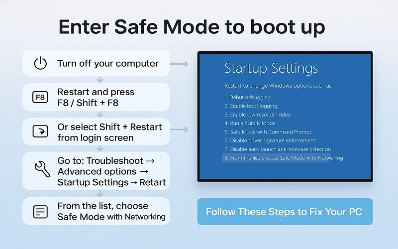 - Troubleshoot → Advanced settings → Startup setup → Restart